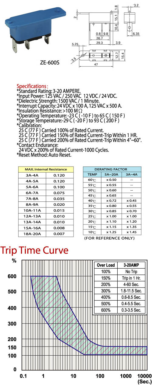 25°C(77°F) Carried 200% of Rated Current-Trip Within 4”~60”.