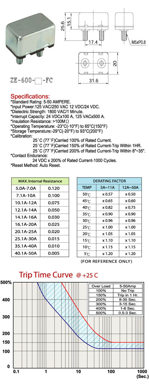 25°C(77°F) Carried 200% of Rated Current-Trip Within 8”~35”.