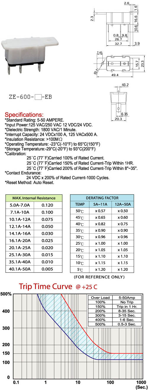 25°C(77°F) Carried 200% of Rated Current-Trip Within 8”~35”.