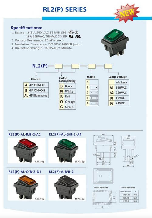 *Rating: 10 A 125 VAC/ 6A 250 VAC. *Contact Resistance: 20 MΩ (max). *Insulation Resistance: DC 500V 1000 MΩ (Min.) *Dielectric Strength: 1500 VAC/1 Minute. *Safety Approval: UL CSA VDE